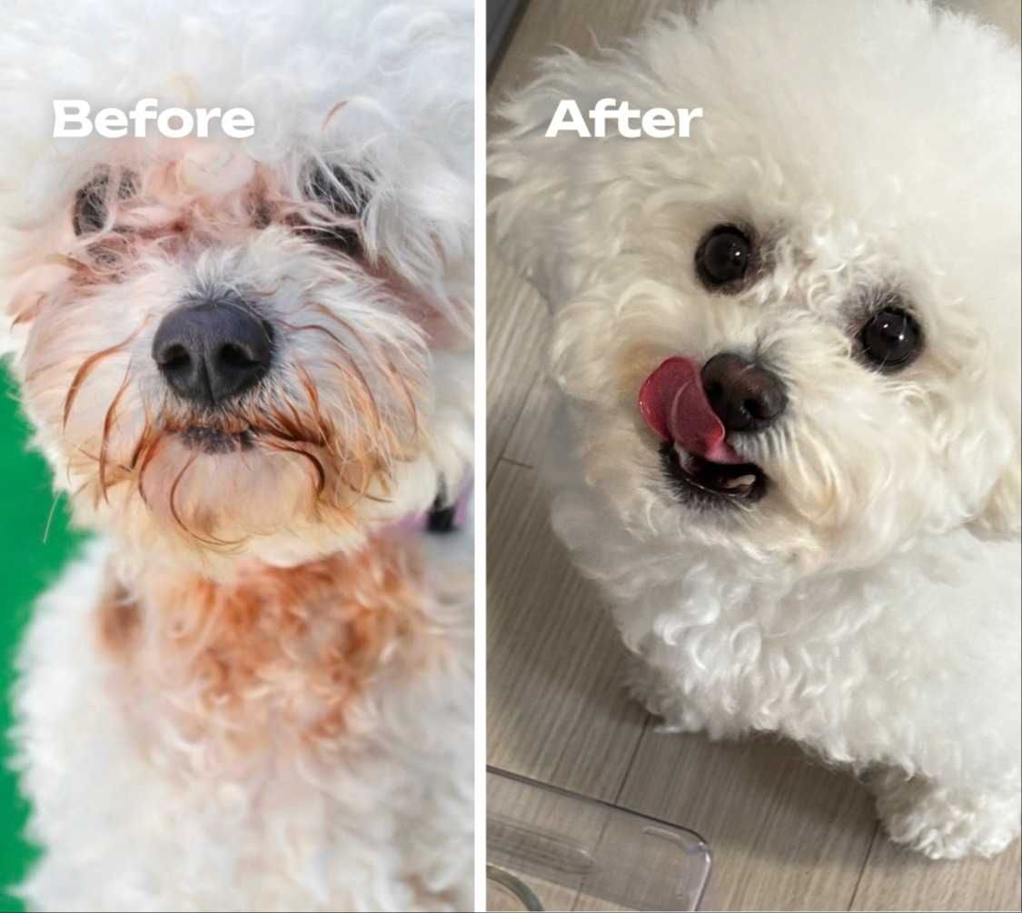토미는 처음 데려왔을 때부터 피부 상태가 좋지 않았어요. 눈물 자국이 깊고, 목에는 짖음방지기 흉터도 있었고요. 처음부터 발사탕이 심했는데, 한 달이 지나도 계속 등을 물어뜯고 계속 발을 핥더라고요.