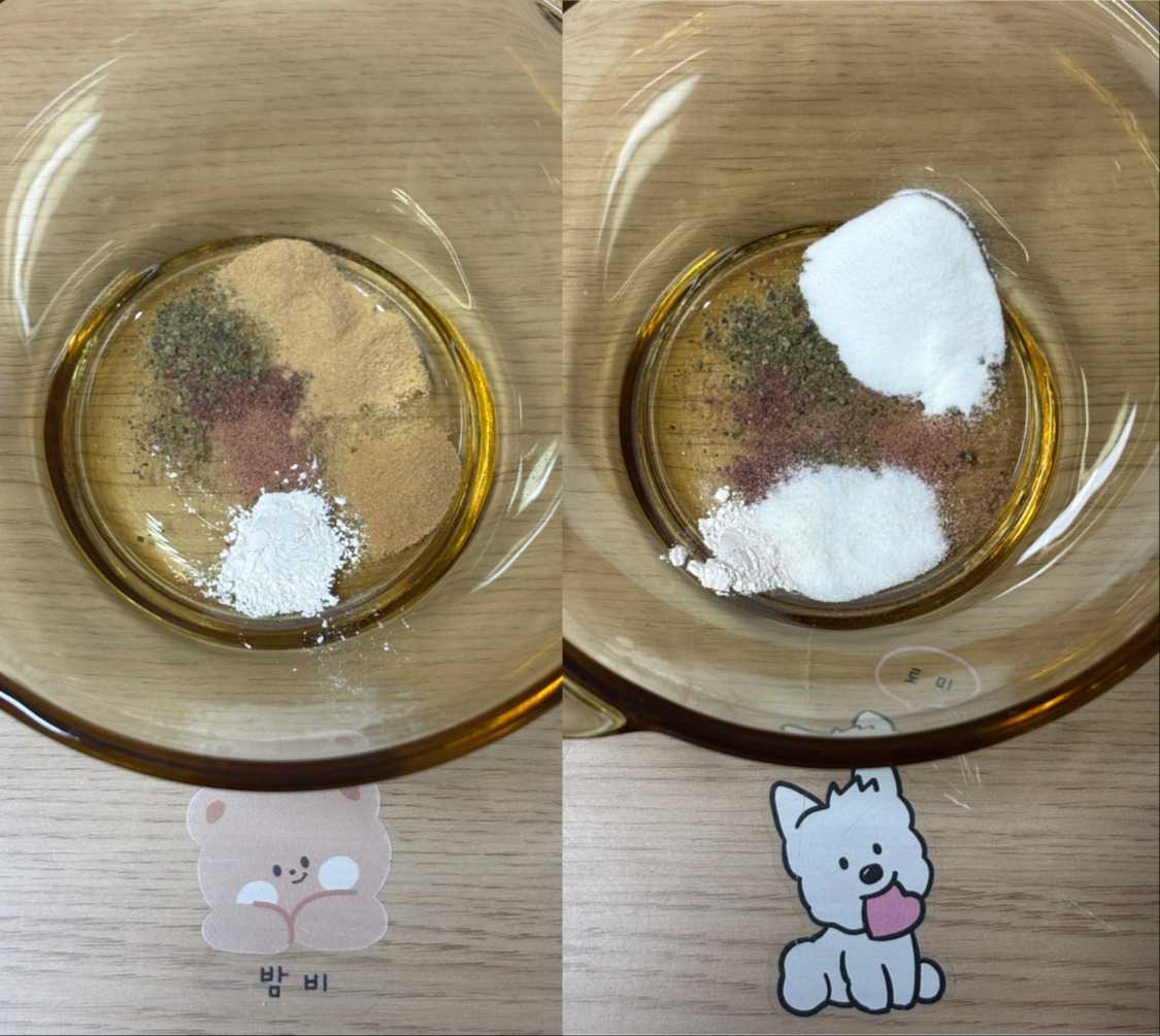 사료를 완전히 안 주는 건 아니에요. 탄수 비율이 높다 하더라도 영양 성분을 맞춘 식품이라고 생각하거든요. 하지만 밤비와 토미는 마당이 넓은 집에 사는 것도 아니고, 하루에 3-4번 씩 산책을 나가는 가족 구성원이 많은 집에 사는 것도 아니라서 식사 시간만큼은 다양한 음식의 향과 맛을 경험했으면 하는 바람이에요.