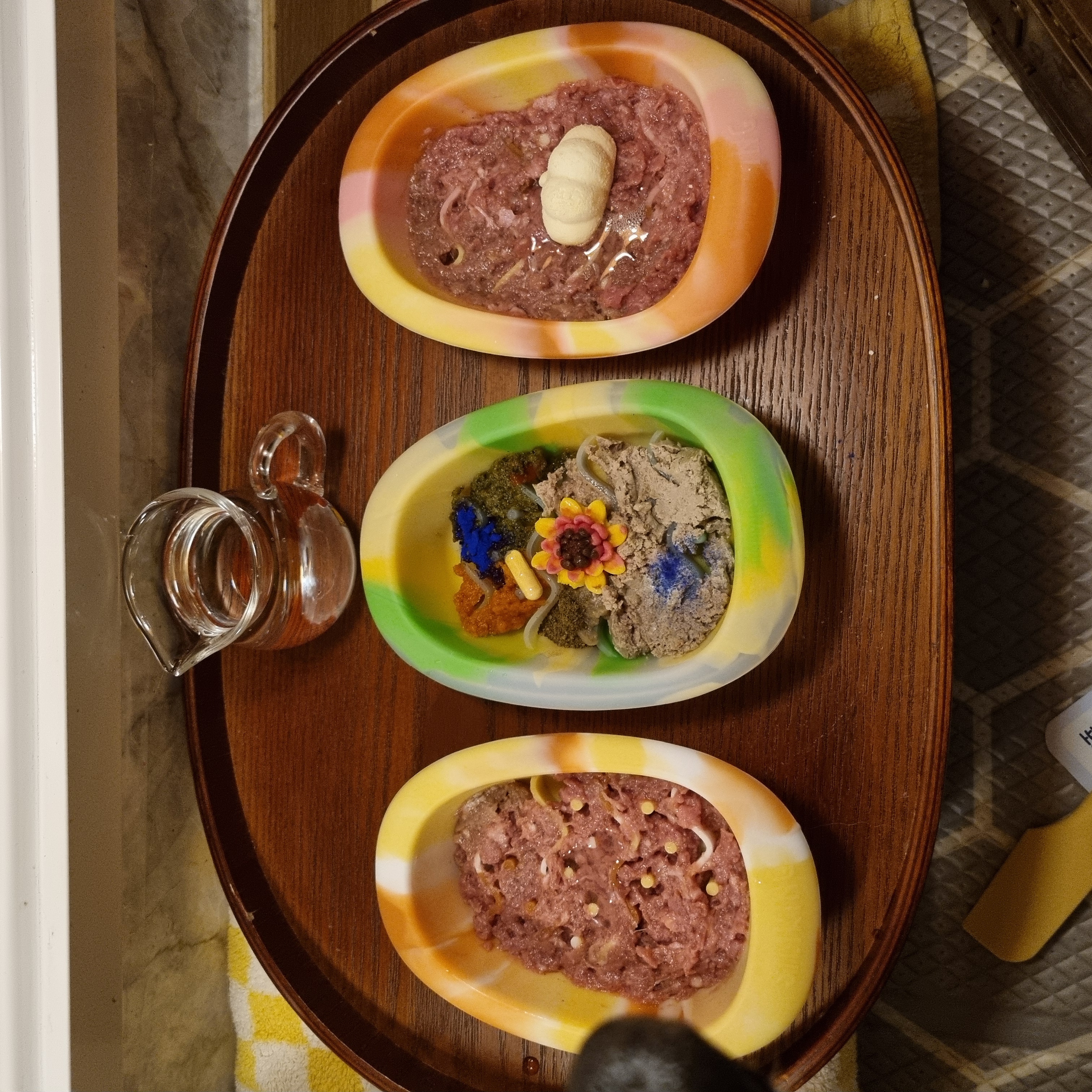 전날 아침 냉장 해동을 하고, 당일 아침에 냉장고에 있는 땅콩이 전용 박스를 꺼내서 밥을 차려주는 데 급하게 먹는 친구라 슬로우 피더 그릇 3개에 나눠서 차려주면 5분 정도 걸리는 것 같아요!