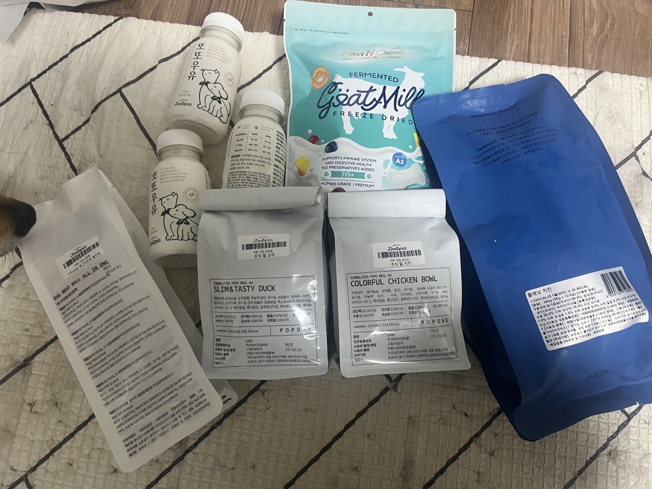 지금은 여러 브랜드의 동결건조 사료, 생식, 화식을 번갈아 급여하고, 토퍼도 칼슘:인 비율과 영양 균형을 고려해 선택하고 있어요. 산책 중이나 후에 간식을 주기 때문에, 주식 양은 조금 줄여서 조절하고 있답니다.