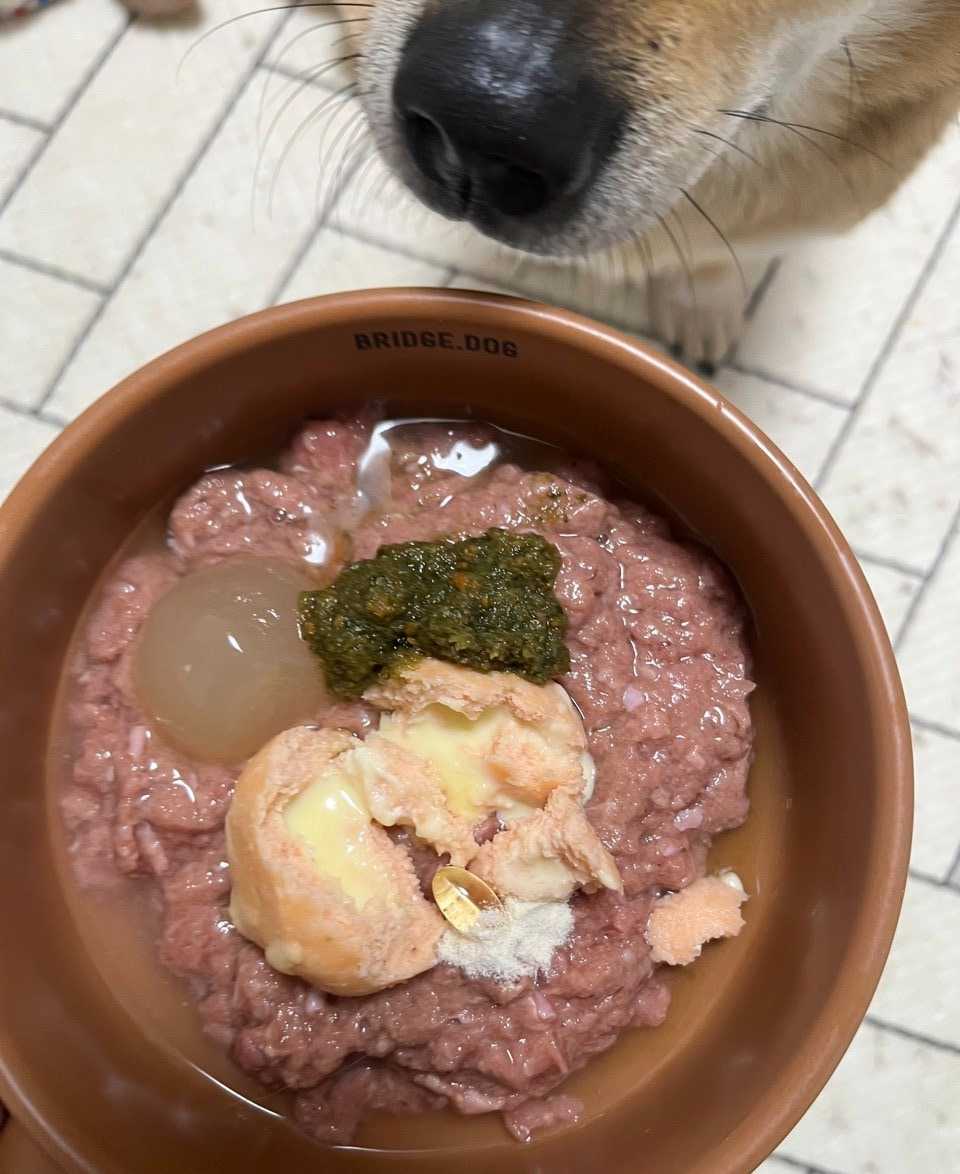 빈이는 아침엔 사료, 저녁엔 자연식을 먹고 있어요. 아침저녁 모두 자연식을 급여할 때도 있었지만, 아침엔 제때 먹지 않는 날이 있어 사료에 본브로스를 부어주기 시작했어요. 그랬더니 잘 먹더라고요.