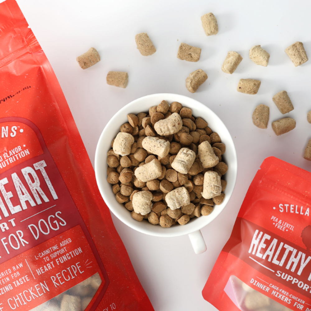동결건조로 만든 헬씨하트는 사료 위에 올리는 토핑이나 간식으로 급여 가능해요.