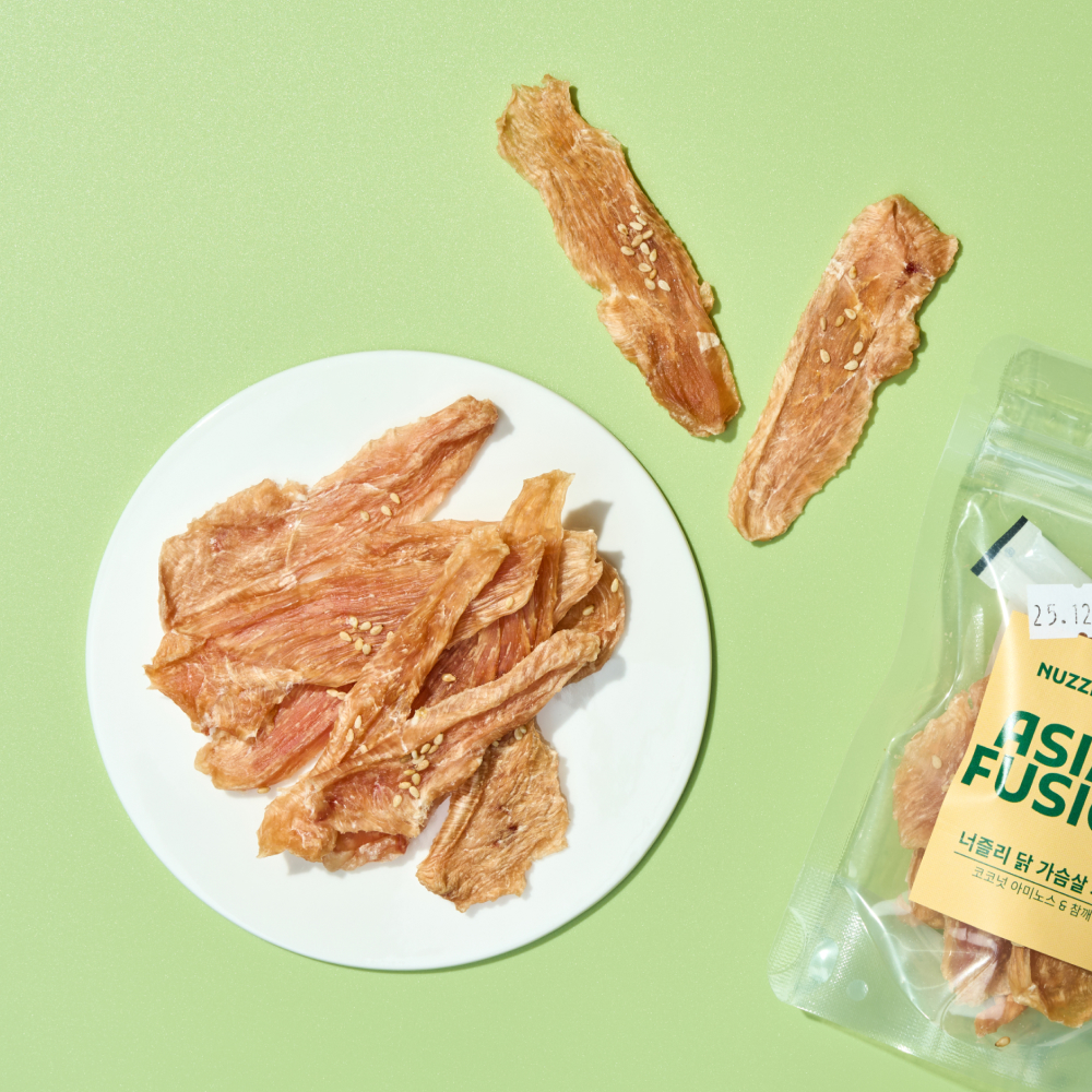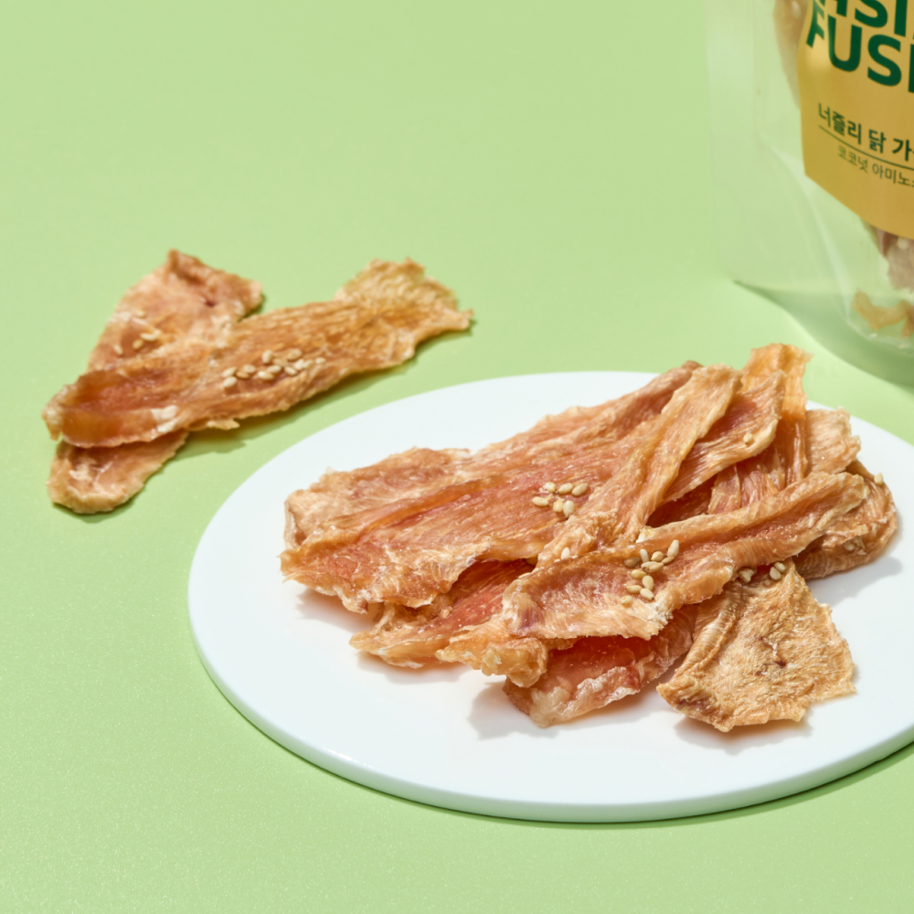 닭 가슴살은 지방 함량이 낮고 활용도가 높은 단백질원으로, 일상적인 단백질 보충 간식에 적합해요. 코코넛 아미노스와 참깨를 소량 더해 미네랄과 식물성 영양소를 보완해, 식단 흐름을 해치지 않는 구성을 갖췄습니다.