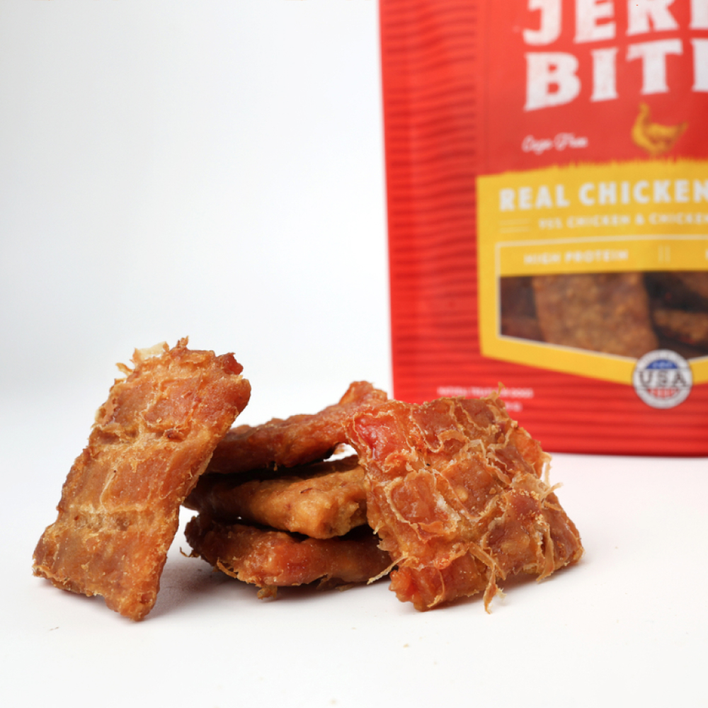 치킨 져키 바이트는 건강하고 믿을 수 있는 원재료인 초원에서 방목하여 키운 닭으로 제조되었어요.