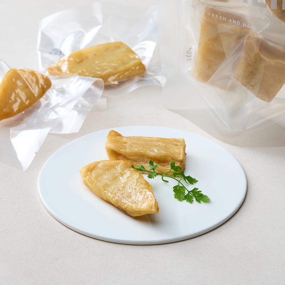 광어는 살코기 결이 단단하면서도 담백한 어종인데요. 담수 세척 후 염분과 불순물을 제거 하고 세번에 걸쳐 가시 손질과 6시간 이상 건조로 쫄깃한 식감의 간식이에요.