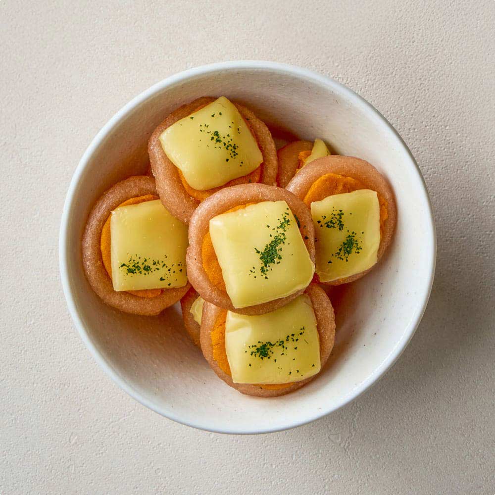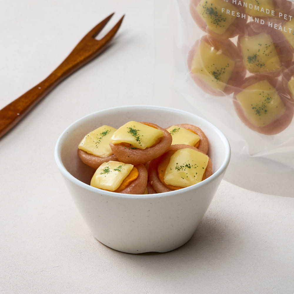 닭가슴살은 단백질 비율이 높은 육류 원료로, 지방 함량이 비교적 낮은 편이에요. 비타민 B군과 미네랄이 언급되는 단백질 공급원입니다. 단호박은 베타카로틴을 포함한 식물성 원료이고, 치즈에는 단백질과 칼슘이 들어 있는 구성인데요. 단백질 중심 간식에 식물성 원료를 더한 보조 간식으로 참고할 수 있어요.